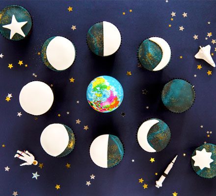 Roll out the white icing to about 0.5cm thick. Utilizing a small sharp knife, lower out 2 skinny crescent shapes to make the waxing and waning crescent. Utilizing a 7cm cutter, lower out 4 rounds. Lower one spherical in half to make the primary and third quarter of the moon. Depart one spherical as it’s to make the total moon and lower a small crescent away from the remaining 2 rounds, to make the waxing and waning gibbous moon. Utilizing a bit of the icing paste, stick every form on to a cake. Depart one cake with nothing on – this would be the new moon. Use a star-shaped cutter to embellish the 4 cupcakes not included within the cycle with the leftover white icing.