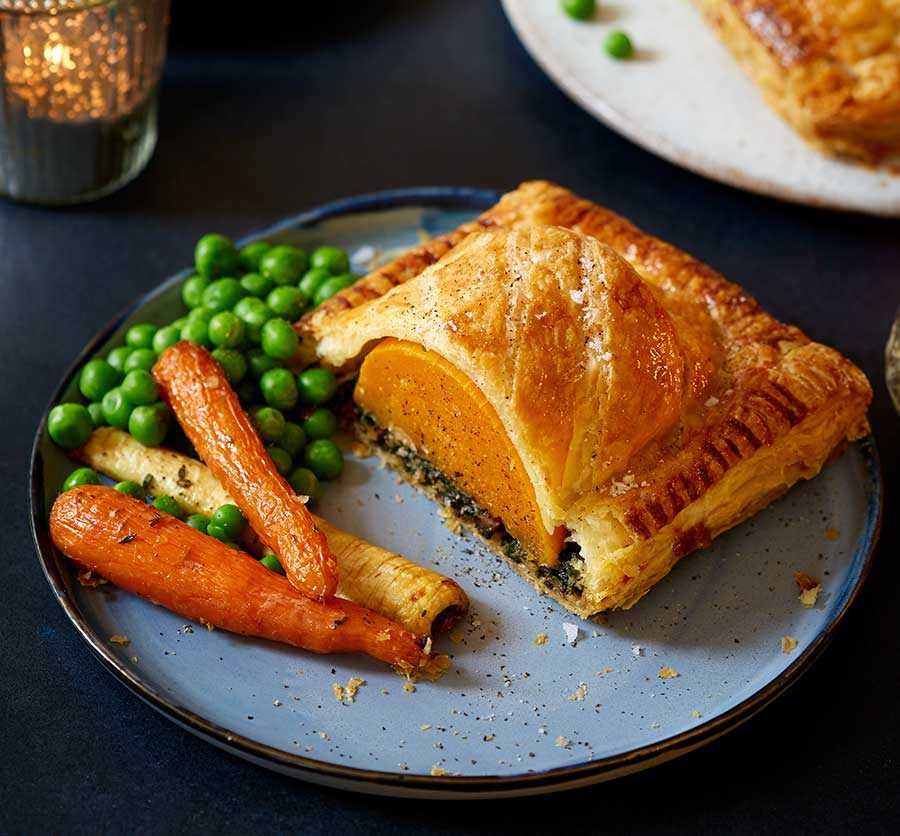 Bake these vegetarian feast pastries for an important day, like Christmas Day. They're stuffed with squash, spinach, chestnut mushrooms and tangy blue cheese