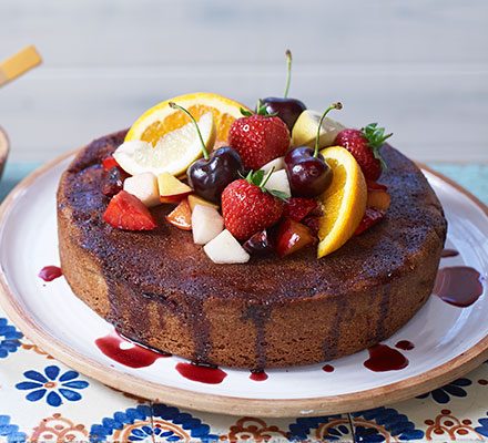As soon as the cake is cool sufficient to deal with, however ideally nonetheless a bit of heat, warmth the remaining pink wine and orange liqueur along with the granulated sugar in a pan till melted, increase the warmth and boil for a couple of minutes till syrupy. Flip the cake over and pile the remainder of the fruit on high of the cake with then pour the boozy syrup over.